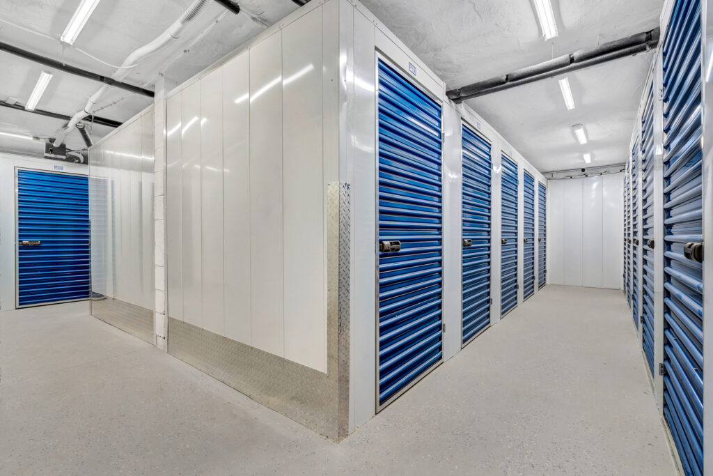 The storage room is located in a room inside the parking garage and can be accessed from the building’s elevator.